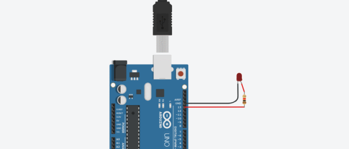 - The LED’s long leg is connected to pin 13 through the resistor.